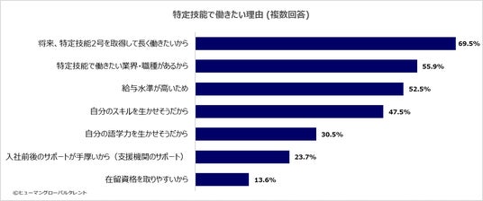 特定技能として働きたい理由では、「将来、特定技能2号を取得して長く働きたい」(69%)が最も多く、多くの受講生が日本での安定したキャリア形成を望んでいます。
