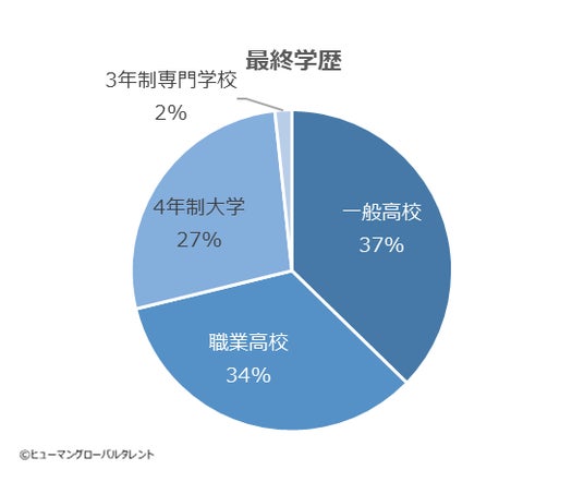 回答者は主に24歳までの若手が70%、男女比は6:4、日本語レベルはN4またはN5が多く、最終学歴は「一般高校」が37%、「4年制大学」が27%と、多様な学歴を持つ受講生がいます。