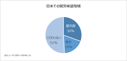 勤務エリアについては、約半数(51%)が「こだわらない」と回答。理由としては(自由記述)「場所よりも信頼できる会社を重視したい」「日本の多様な文化を体験したい」といった柔軟な姿勢が見られます。都市部希望者(30%)は利便性や文化的なアクセスを、地方希望者(19%)は経済的メリットや静かな環境を理由に挙げています。