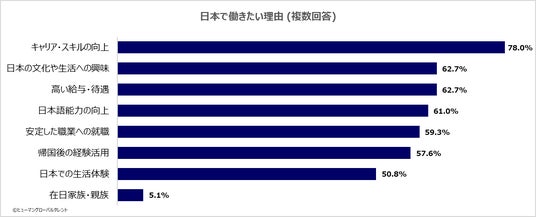キャリア・スキルの向上、給与・待遇、日本の文化への興味が日本で働きたい主要な動機であり、加えて福利厚生や良好な人間関係といった非経済的な側面も非常に重視する傾向があります。