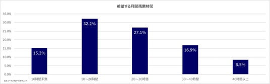 希望する月間残業時間は、「10~20時間」(30.4%)と「20~30時間」(28.6%)が約6割を占め、過度な残業は避けつつも、ある程度の残業は許容し、ワークライフバランスと収入のバランスを重視する傾向が見られます。