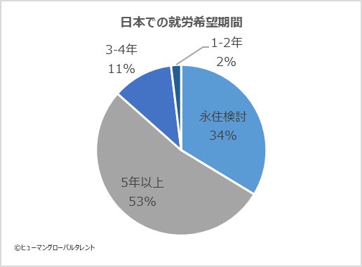 就労期間については、半数以上(53%)が「5年以上」の長期就労を希望し、約3人に1人(34%)が「永住も検討したい」と回答。短期的な労働に留まらない、日本での長期的な就労・キャリア形成への強い意欲が明確に示されています。