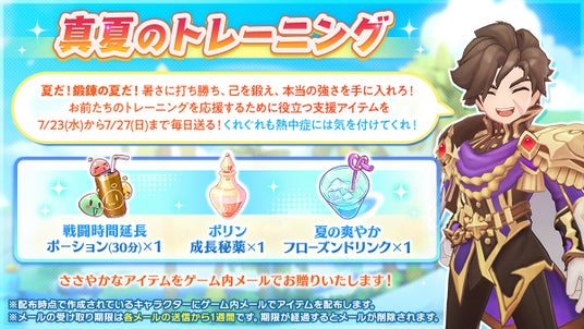 「真夏のトレーニング」イベント期間中は毎日、戦闘時間を回復できる「戦闘時間延長ポーション(30分)」や、夏にぴったりの「夏の爽やかフローズンドリンク」などが獲得できます。
