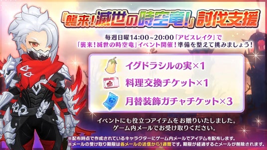 毎週日曜日14:00 ~ 20:00に「アビスレイク」にて、大規模"モンスター襲来イベント"が開催されるようになります。「時空巨竜」にダメージを与えると、討伐できなくても参加報酬の権利を獲得できます。