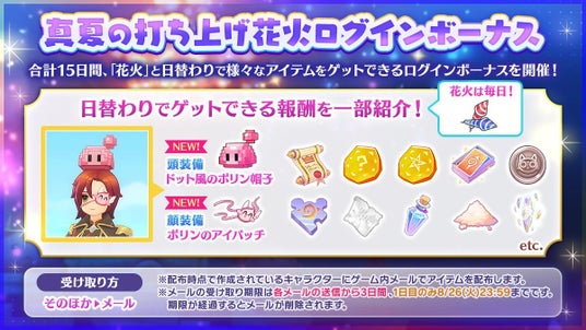 さらに、「真夏の打ち上げ花火ログインボーナス」では「花火」をはじめ、さまざまな強化素材や新装備なども獲得できます。