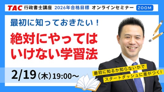行政書士試験対策講座を展開しているTAC株式会社(東京都千代田区、代表取締役:多田敏男)は、2月から行政書士試験の学習スタートをお考えの初学者の方を対象に、無料オンラインセミナーを2/19(木)19時より開催します。