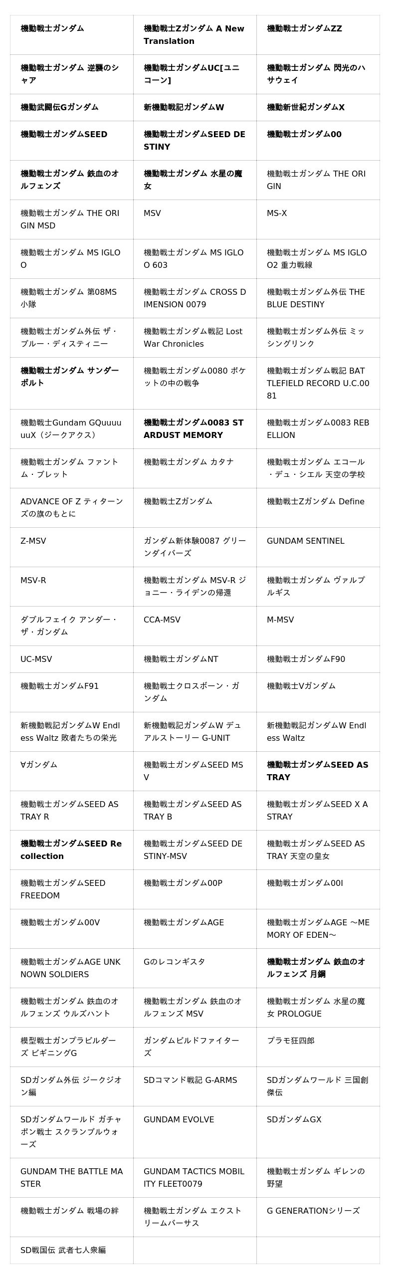 ※太字はメインステージ及び、ヒストリーステージとしてシナリオが収録されている作品です