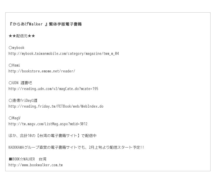 『からあげWalker』繁体字版電子書籍は、現在台湾の10の電子書籍サイトで配信されているほか、KADOKAWAグループ直営の人気電子書籍サイト『BOOK☆WALKER』の台湾版ストア『BOOK☆WALKER 台湾』でも、2月上旬から配信がスタートする予定です。