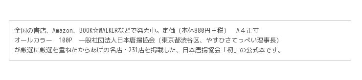 ウォーカームック『からあげWalker』は、一般社団法人日本唐揚協会(東京都渋谷区、やすひさてっぺい理事長)が厳選に厳選を重ねたからあげの名店・200店以上を掲載した、日本唐揚協会「初」の公式本です。発売当日にAmazonが完売、発売から2カ月弱で3刷が決定、テレビやラジオでも多数取り上げられるなど大きな話題を呼び、日本の“からあげブーム”を再燃させるきっかけとなる一冊になりました。