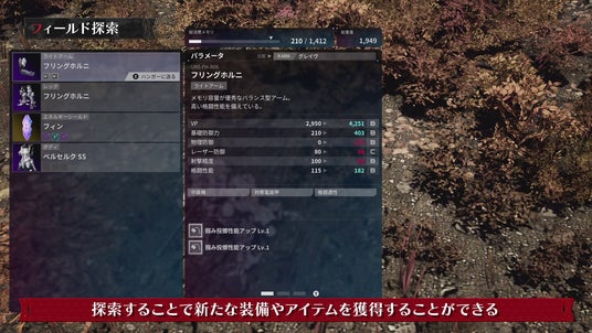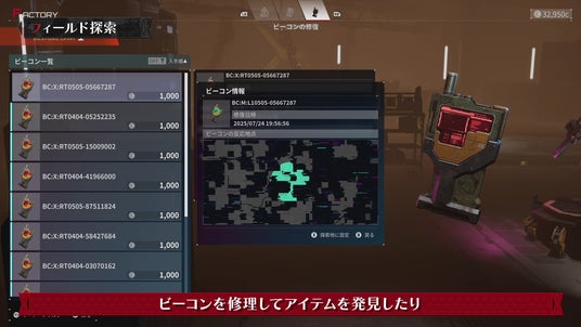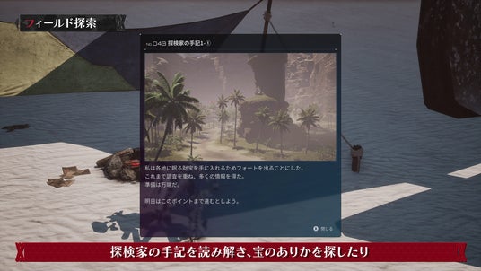探検家の手記を読み解き宝のありかを探したり、ビーコンを修理してアイテム発見したり、、、フィード探索をすることで新たな装備やアイテムを獲得することができる。