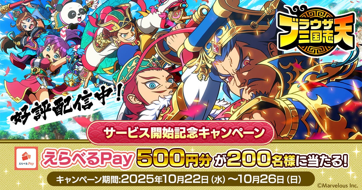 株式会社マーベラス(代表取締役社長:照井 慎一/所在地:東京都品川区)は、スマートフォンアプリゲーム『ブラウザ三国志 天』(略称:ブラ天)が2025年10月22日(水)15時にサービス開始したことをお知らせいたします。