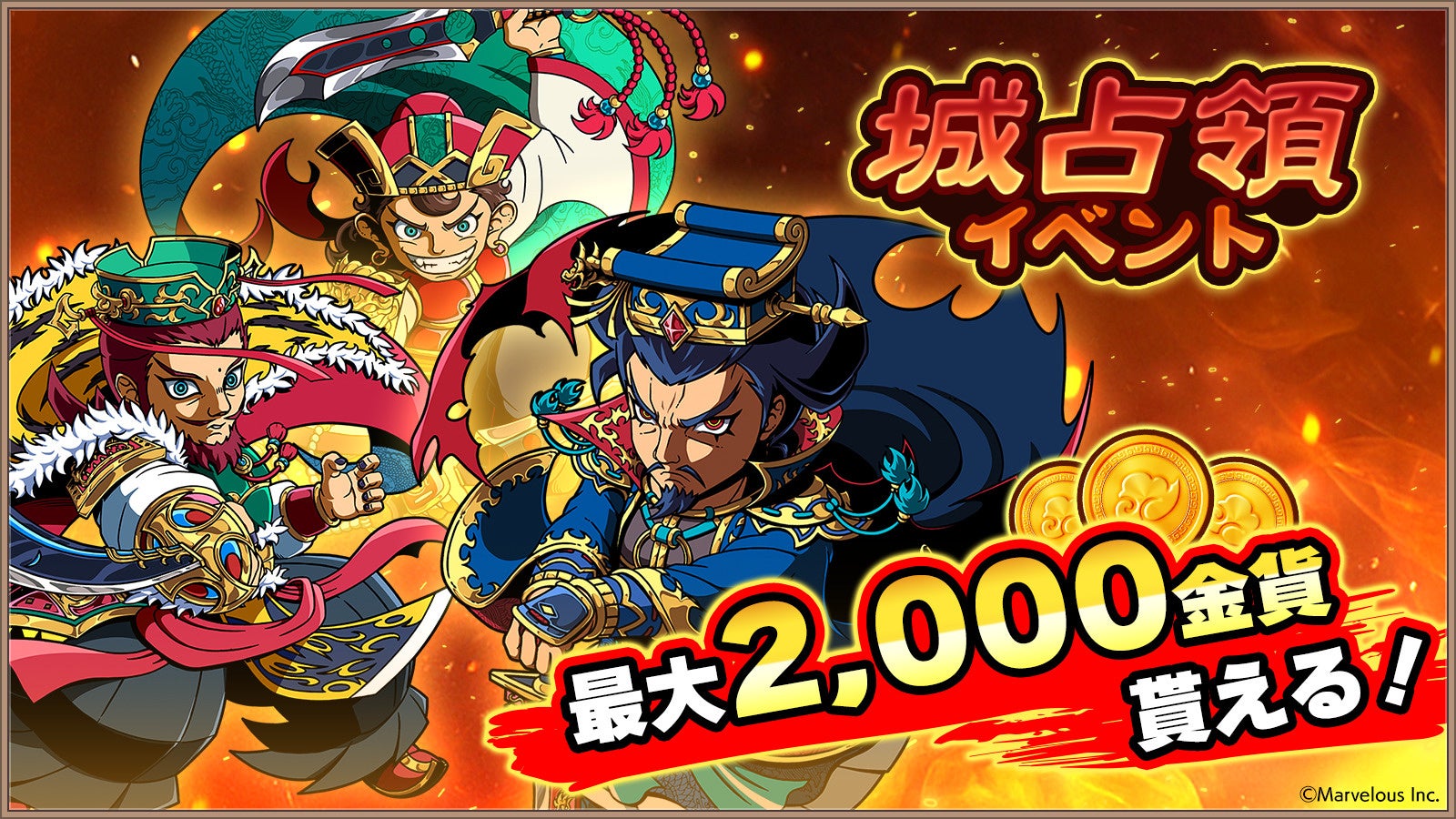 また、★5戦闘武将確定メダルなどがもらえる「初心者ログインボーナス」や最大2,000金貨がもらえる「スタートダッシュイベント」などの豪華キャンペーンも開始したことをお知らせいたします。