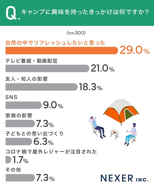 今回の調査では、キャンプに興味を持つきっかけとして「自然の中でリフレッシュしたい」という声が最も多いことがわかりました。