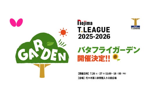 Tリーグでは、2025年7月26日(土),27日(日)に代々木第二体育館にて行われる、ノジマTリーグ 2025-2026シーズン 開幕戦の会場の外にて、人気のキッチンカーが集合するフードコートや、パブリックビューイング、各種ブースが展開される「バタフライガーデン」を開催します。