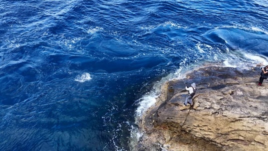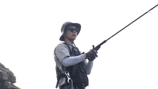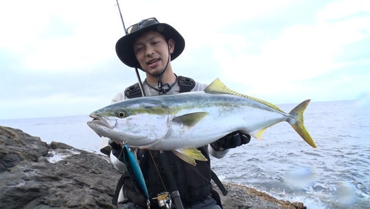 アングラーはショアジギングのエキスパート、松永昌己。熊本県を拠点にヒラマサ、ブリ、ヒラスズキを求めて九州の磯を渡り歩く実力派若手ルアーマン。対馬には10年以上通っているという松永。