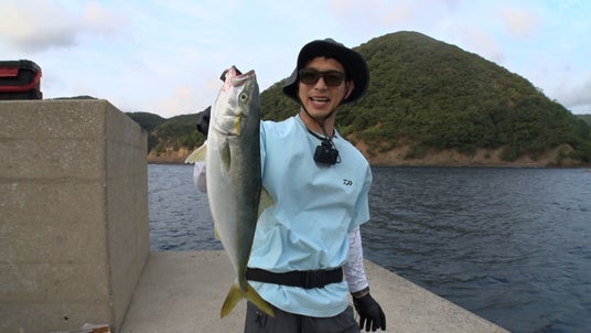ブリの若魚ヤズ、カンパチの若魚ネリゴを釣り上げ大喜びの松永。堤防から青物が釣れる、これが対馬のポテンシャルだ。