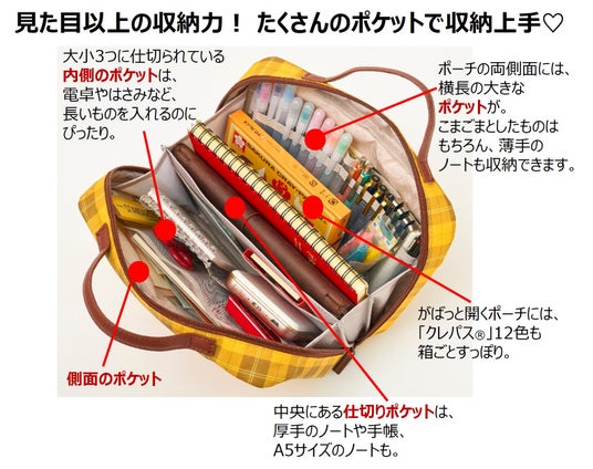 「クレパス(R)」柄がかわいい♪ ポケットいっぱいの大容量文具ポーチ
