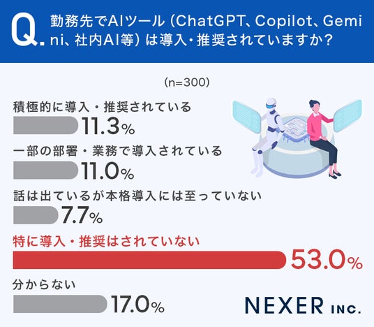 ■53.0%が、勤務先でAIツールは「特に導入・推奨はされていない」と回答