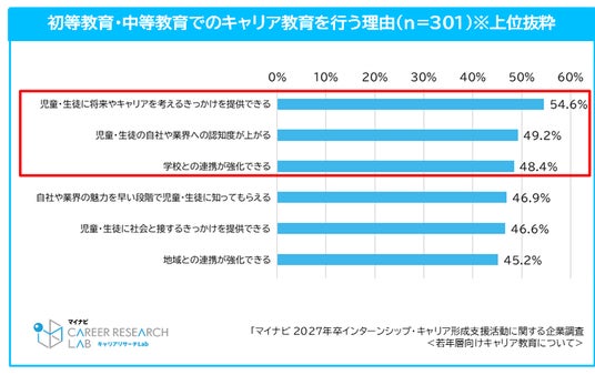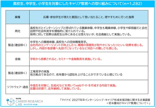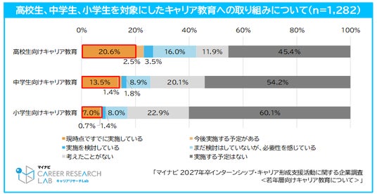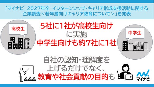 株式会社マイナビ(本社:東京都千代田区、代表取締役 社長執行役員:土屋芳明)は、大学1、2年生向けのキャリア教育や、より若年層に向けたキャリア教育への企業の取り組み状況をまとめた「マイナビ 2027年卒インターンシップ・キャリア形成支援活動に関する企業調査<若年層向けキャリア教育について>」の結果を発表しました。