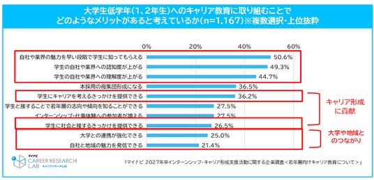 また、企業が大学低学年のキャリア教育に取り組むメリットについては、「自社や業界の魅力を早い段階で学生に知ってもらえる(50.6%)」がもっとも多く、「学生の自社や業界への認知度が上がる(49.3%)」、「学生の自社や業界への理解度が上がる(44.7%)」と続いた。