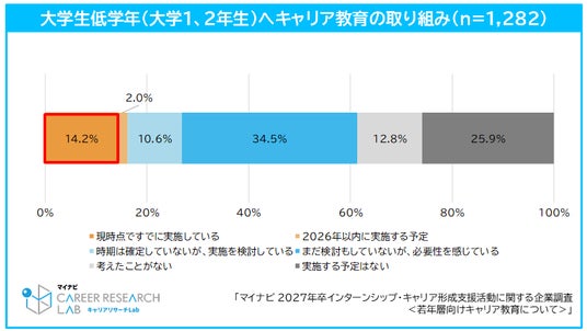 ◆大学生低学年(大学1、2年生)向けのキャリア教育に取り組む企業は14.2%。半数近くの企業が今後の実施に前向き