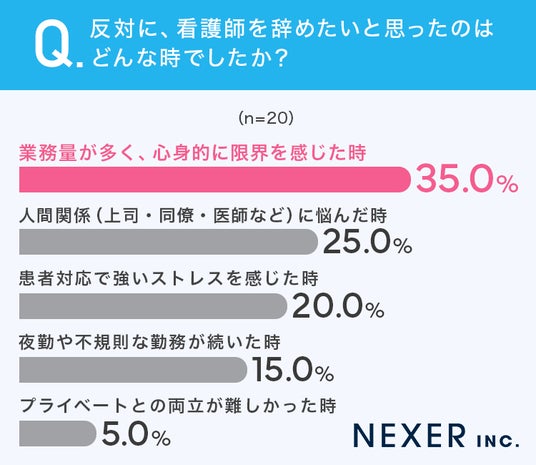 最も多かったのは「業務量が多く、心身的に限界を感じた時」で35.0%でした。次いで「人間関係(上司・同僚・医師など)に悩んだ時」が25.0%、「患者対応で強いストレスを感じた時」が20.0%という結果でした。