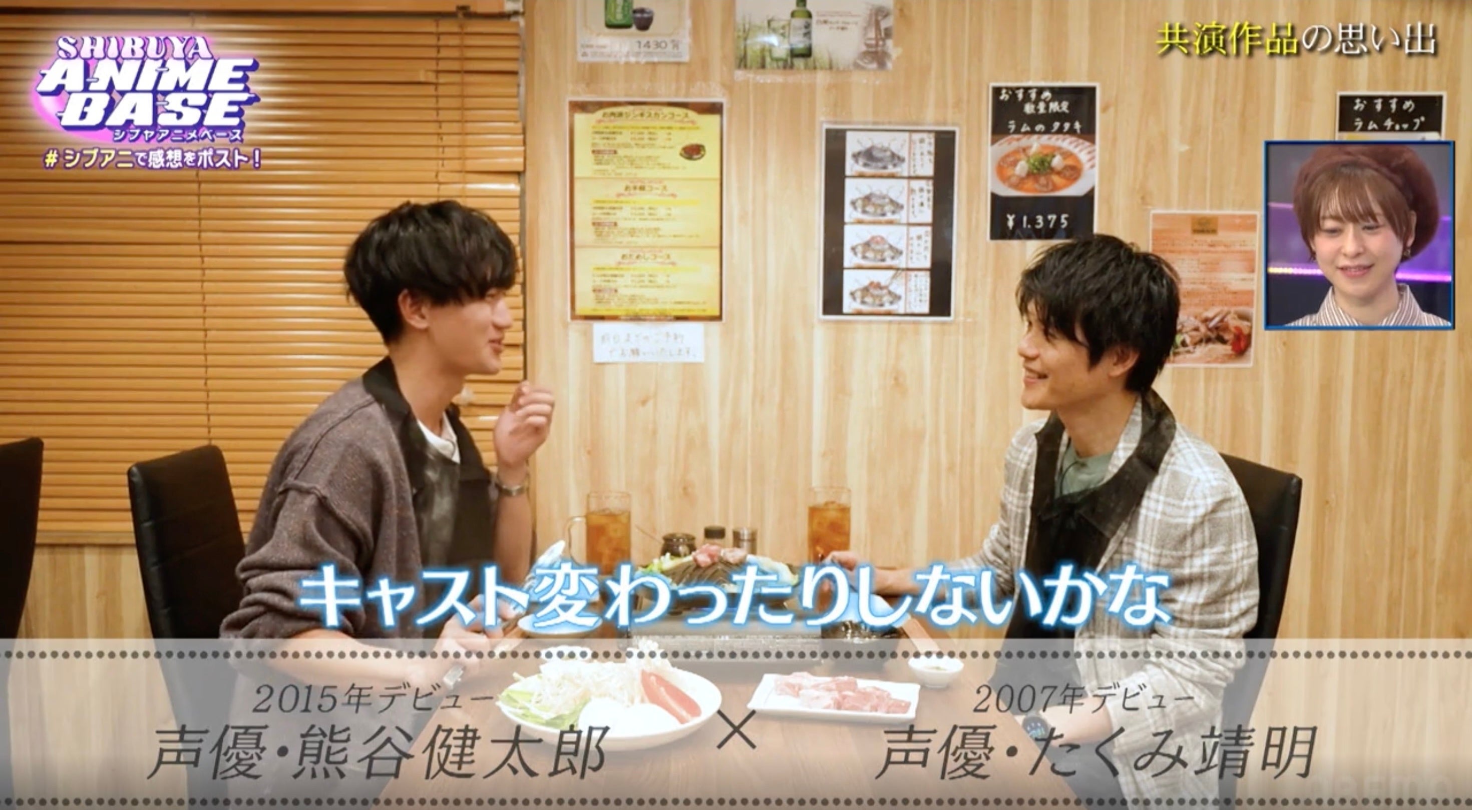 続いて、番組が2人のアニメ関係者をカップリングし、食事をしながらトークを繰り広げる「カプカプトーク」にはたくみ靖明&熊谷健太郎が登場。2007年デビューの先輩・たくみと2015年デビューの後輩・熊谷はジンギスカンを食べながら仲睦まじい会話を繰り広げます。