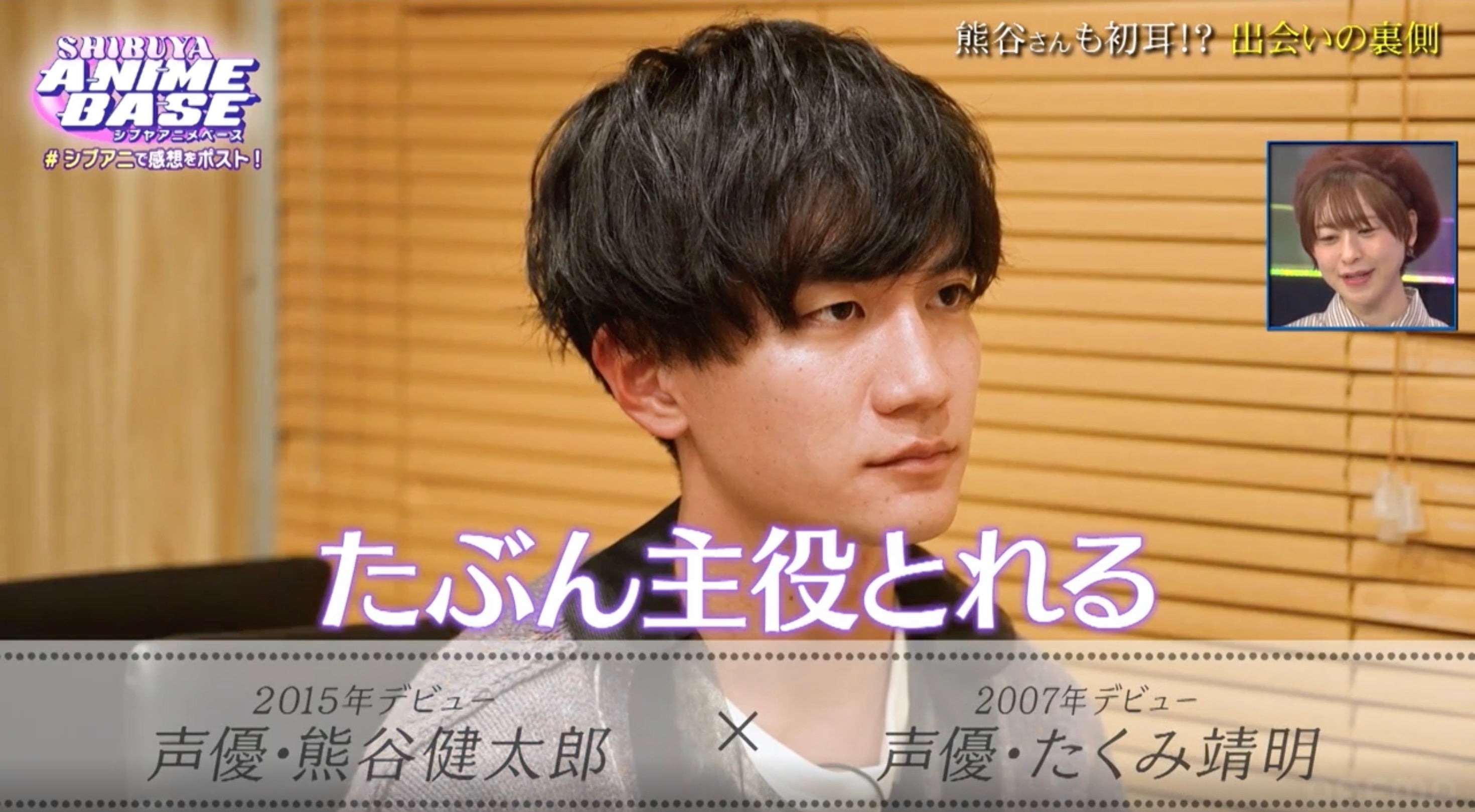 そもそも2人の出会いについて熊谷は「機動戦士ガンダム 鉄血のオルフェンズ』をやらせていただいたときだと思うんですけど…」と口を開くと、たくみは「俺はちょっと違っていて、事務所が一緒だからマネージャーが『今期待している子がいるので、たくみさんの現場を見学させてくれませんか?』とマネージャーに言われて、ゲームの収録にきてくれた」といい、このことを思い出した熊谷は「すみません!」とすかさず謝罪。さらに、たくみは「その後マネージャーより知らないと思うけど、『ぶっちゃけ熊谷(のアフレコ)どうでした?』って(言われた)」と裏話を語ると、熊谷は「怖い、怖い、怖い!」と口にします。しかし、熊谷の不安とは裏腹に、たくみは「今さらうそでしょ?って思われるかもしれないけど、『主役獲る子だと思うよ』って言った」と打ち明け、熊谷を喜ばせます。