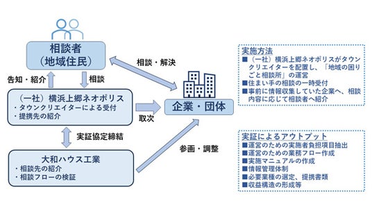 (一社)横浜上郷ネオポリスが住まいや暮らしに関わる「地域の困りごと相談所」を設け、住民の相談内容に応じて解決可能な協力企業や団体を紹介。大和ハウス工業は、協力企業・団体の選定や連携体制の構築の他、事業スキームの検証や改善提案を行う予定です。