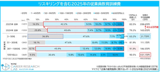 従業員への教育投資状況について聞くと、2025年にリスキリングを含む従業員の教育訓練費に「1万円以上投資した(計)」企業は83.5%と、前年(79.2%)より4.3pt増え8割を超えた。