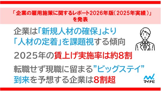 株式会社マイナビ(本社:東京都千代田区、代表取締役 社長執行役員:粟井俊介)は、中途採用業務を担当する企業の人事担当者1,500名に実施した、「企業の雇用施策に関するレポート2026年版(2025年実績)」の結果を発表しました。