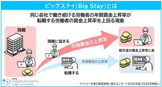 日本では転職率の増加により「大転職時代」とも言われているが、アメリカでは同じ会社に留まる労働者の年間賃金上昇率が、転職する労働者の賃金上昇率を上回る「ビッグステイ(Big Stay)」と呼ばれる現象が見られている。