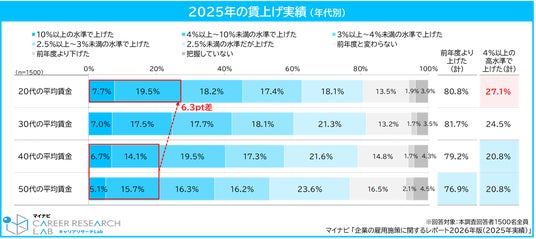 「40代・50代」は各20.8%にとどまり、「20代」との差は6.3ptとなった。賃上げ自体の実施率には年代差が少ない一方、賃上げの水準で見ると、若い年代ほど“高水準”である傾向がみられた。