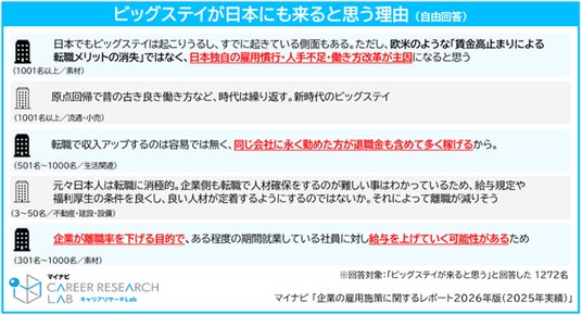 日本にもビッグステイが来ると思う理由には、「日本独自の雇用慣行・人手不足・働き方改革が主因になり得る」「同じ会社に永く勤めた方が退職金も含めて多く稼げるから」「企業が離職率を下げる目的で、ある程度の期間、就業している社員に対し給与を上げていく可能性がある」などの意見が見られた。【図4、5、6】
