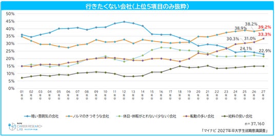 ◆ 学生が行きたくない会社では、「ノルマのきつそうな会社」が最多。2番目に回答が多い「転勤の多い会社」は6年連続増加【図2】