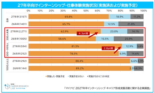 学生の就職先における企業志向を聞いたところ、大手企業志向(「絶対に大手企業がよい」と「自分のやりたい仕事ができるのであれば大手企業がよい」の合計) は前年比0.9pt減の50.9%で、2年連続で減少した。「中堅・中小企業がよい」は44.0%で前年比1.0pt増となり、2年連続で増加した。インターンシップ・仕事体験の実施率(実施した、もしくは実施予定とする企業の割合)を企業規模別でみると、「300~999人(81.3%)」は前年比2.8pt増、「300人未満(62.9%)」は前年比4.3pt増だった。インターンシップ・仕事体験を実施する企業ほど、採用が成功しやすい傾向にある。これまで中小企業の実施率はあまり高くなかった中、徐々にインターンシップ・仕事体験の実施を通して学生へ自社の魅力を伝える企業が増えた結果、学生の中小企業志向も高まったと考えられる。【図3、4】