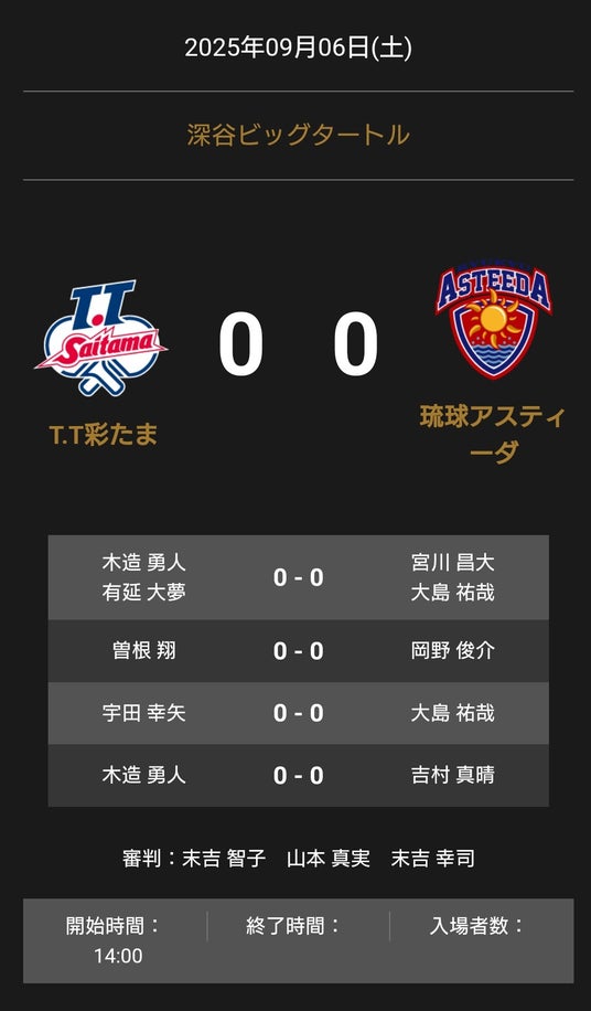 ノジマTリーグ 2025-2026 公式戦 9月6日開催 の「T.T彩たま vs 琉球アスティーダ」のオーダーを発表いたします。