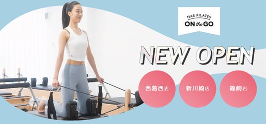 今回新たにオープンするのは、「NAS PILATES ON THE GO 西葛西店(東京都江戸川区)」「NAS PILATES ON THE GO 新川崎店(神奈川県川崎市)」「NAS PILATES ON THE GO 篠崎店(東京都江戸川区)」の3店舗で、既存の2店舗と合わせて計5店舗となります。