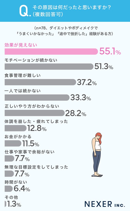 ダイエットやボディメイクで「うまくいかなかった」「途中で挫折した」経験がある方に、その原因を聞いてみました。