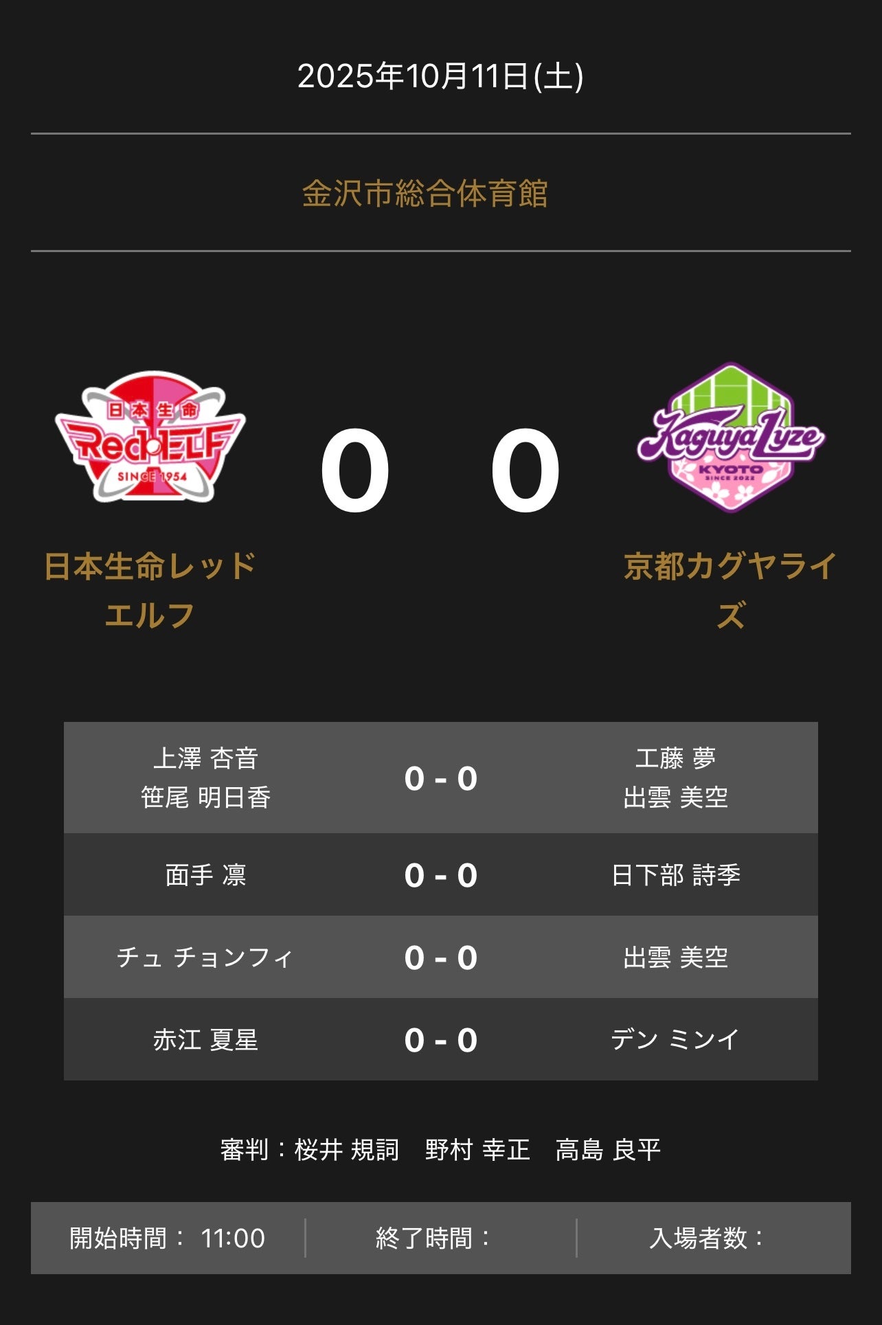 ノジマTリーグ 2025-2026シーズン 公式戦 10月11日開催 日本生命レッドエルフvs京都カグヤライズ の対戦オーダーを発表いたします。
