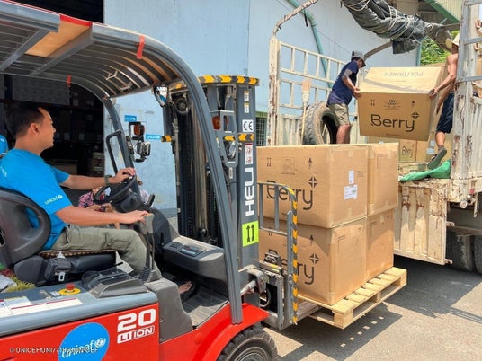 地震の被災地域に届けるため、緊急支援物資をトラックに積み込むユニセフのスタッフ(ミャンマー、2025年3月31日撮影) (C) UNICEF/UNI771850/UNICEF