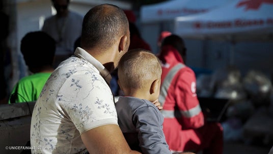 ランペドゥーザ島の一時受け入れセンターにたどり着いた、チュニジアの移民の親子(イタリア、2023年9月26日撮影) (C) UNICEF/UNI443194/Antonioli