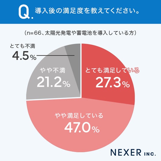 続いて、太陽光発電や蓄電池を導入している方に、導入後の満足度を聞いてみました。