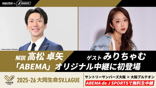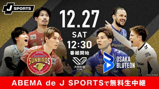 新しい未来のテレビ「ABEMA(アベマ)」は、J SPORTSのコンテンツを視聴できる「ABEMA de J SPORTS」にて、2025年12月27日(土)開催の2025-26 大同生命SV.LEAGUE MEN『サントリーサンバーズ大阪×大阪ブルテオン』を無料生中継することをお知らせいたします。本試合の解説には高松卓矢、ゲストにはみりちゃむが出演します。