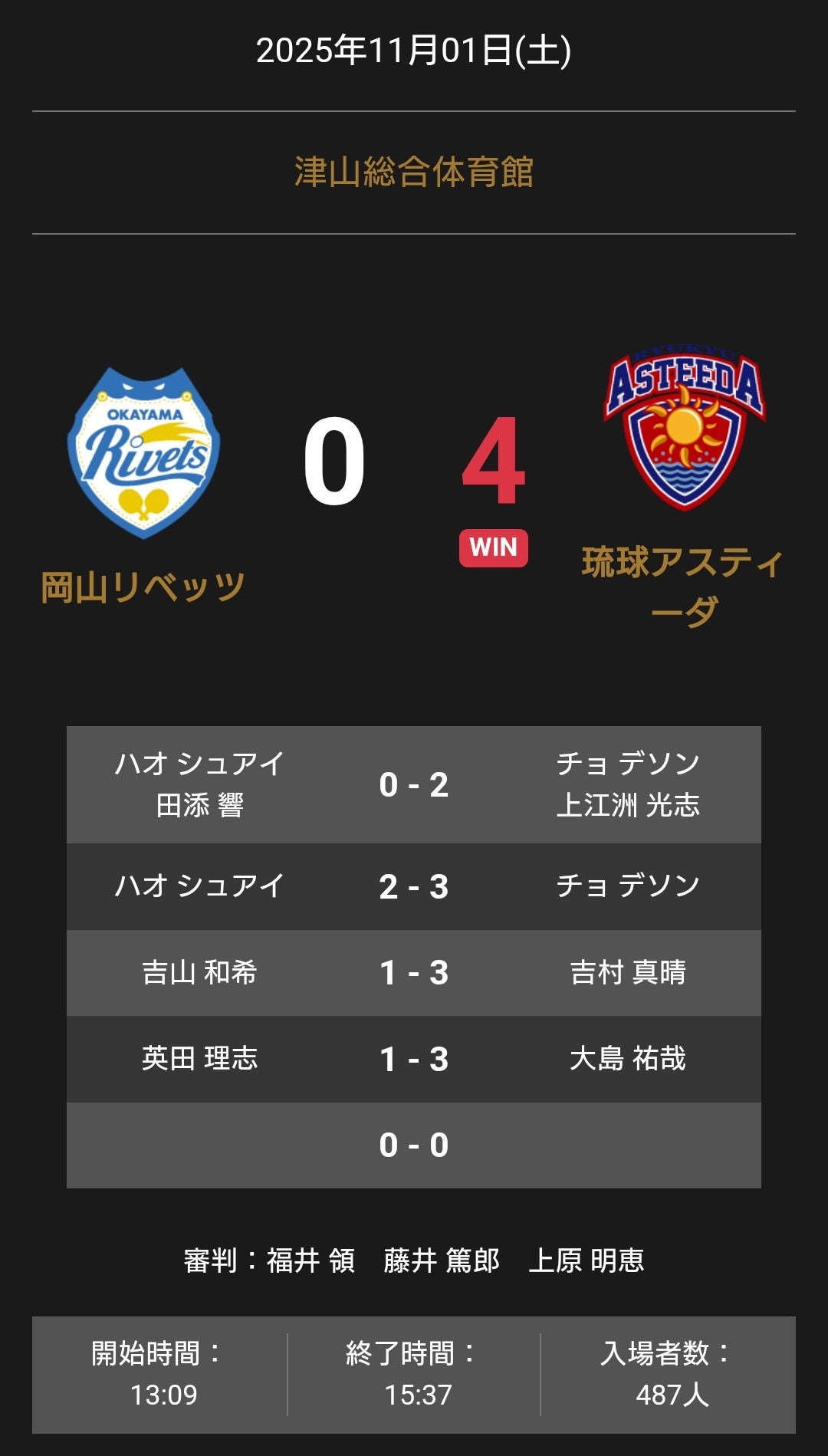 2025-11-01 一般社団法人Tリーグ ノジマTリーグ 2025-2026 公式戦 11月1日開催 岡山リベッツ vs 琉球アスティーダ 試合結果 Tweet 岡山リベッツと琉球アスティーダの試合は、4-0で琉球アスティーダが勝利しました。 企業プレスリリース詳細へ PR TIMESトップへ 公式ツイッター Follow @Straightpress 最新情報をTwitterで受け取ろう! 公式フェイスブックページ 最新情報をFacebookで受け取ろう! 前の記事 一覧へ戻る 次の記事