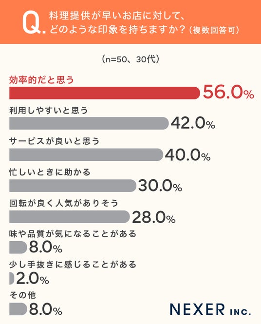 ■料理提供が早いお店への印象「効率的」が最多、30代は56.0%、40代は42.0%