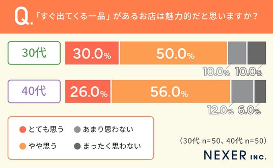 30代・40代ともに約8割が「すぐ出てくる一品があるお店は魅力的」と回答しており、世代を問わず高い支持を集めています。