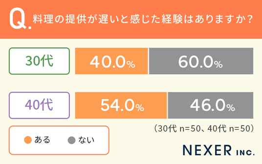 ■料理の提供が遅いと感じた経験、30代は40.0%、40代は54.0%