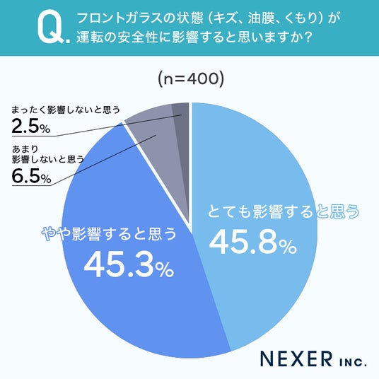 9割を超える圧倒的多数が、ガラスの状態が運転の安全性と結びついていると認識している結果です。普段の意識の高さに差はあっても、安全性への影響を否定する人はごく少数派のようです。