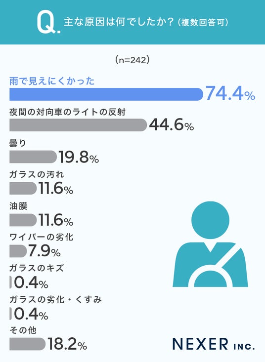 「ガラスの汚れ」と「油膜」はともに11.6%、「ワイパーの劣化」も7.9%挙がっています。